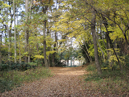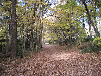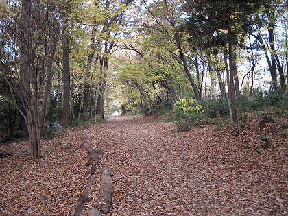 上の写真は落ち葉に覆われた鎌倉街道を南側から北側に向かって撮影したものです。緑地の中の道は静寂を保ち、テレビや映画の時代劇ロケ地のような雰囲気が漂います。