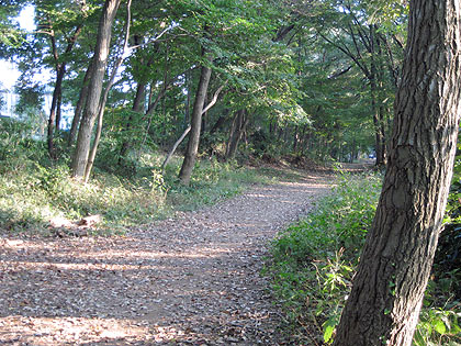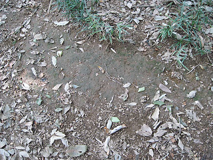 上の写真は10月に撮影したもので北側から南側を撮影しています。落ち葉がないので土の道の状態がよくわかります。この緑地の鎌倉街道で特徴的なものは、現地表面に踏み跡と思われる硬い路面が沢山確認できることです。一般には古道の硬化面は歩かれていた路面中央部に見られることが多いのですが、この緑地内の道では路面中央部は削られていて一部砂利が敷かれていたりします。そして道の両サイドである緩やかな盛り上がり部に硬化面のような硬い路面が多数確認できるのです。この両サイドの硬い路面の存在は、過去にこの道が利用されていたときのものと思われ、現在の道幅よりも広い部分で人が歩いていたことが想像されます。現道の路面幅で約3.5〜4メートルですから、硬い路面が見られるところが道として利用されていた時期の路面幅は6メートル位あったのでしょうか。道幅が6メートル位あるということは鎌倉街道上道の本道と同じ位の道幅であったことが推測されるのです。