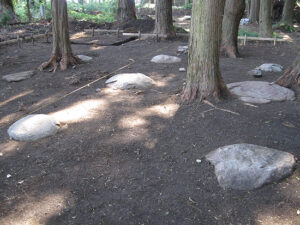 基壇や地面の上に据え置いた礎石の上に柱を立てる建物のことです。長者山遺跡では8棟の礎石建物跡が確認されました。礎石の大きさは1m前後で、柱を据えるための柱座などを設けたものや、周辺に礎石を安定させるための根石が確認されたものもありす。また、赤みを帯び被熱痕のある礎石もあり、建物が火災にあった可能性も考えられます。 礎石建物の下は建物や収納物(穀物など)の重さに耐えられるように「掘込地業」が施されています。「掘込地業」とは、建物の基礎となる地面をいったん掘り下げ、その内部をつき固めながら埋め戻す地盤改良工事のことです。