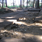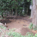 溝跡はいくつか発掘調査で確認されていますが、特に注目すべきは建物群を囲む大型溝跡です。道路跡と並行するように道路跡東側に確認されました。道路に伴う施設の区画溝と考えらます。区画溝の北辺は想定ライン上で確認され、上幅5.22~5.31m、深さ1.74m~1.89mの逆台形状の底面が更に台形状に窪む断面形状であったといいます。南辺は愛宕神社拝殿の西約50m付近がコーナー状に東に折れているのが確認され、南辺調査区36・37で確認された第25号建物跡の柱穴の西までが確認されています。この溝跡は8世紀後半~10世紀まで機能していたと考えられ、土塁や掘り直しの跡も確認されているようです。