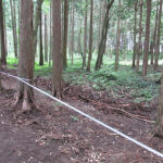 北の山林内に残る切通し状微地形(藻島駅路跡)とは別に神社境内西側にも道路跡が見つかっています。神社社殿の北西植林中に神社「裏参道」と呼ぶ小道があり、調査で裏参道西側中央付近で幅約12mの道路跡、境内林を抜けた南端では幅6.9mの道路跡が確認されました。いずれも東側のみに側溝が確認され西側は路盤と考えられる硬化面の範囲を測ったものとあります。