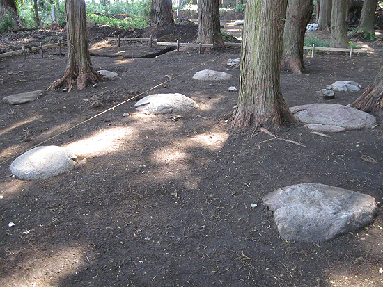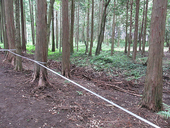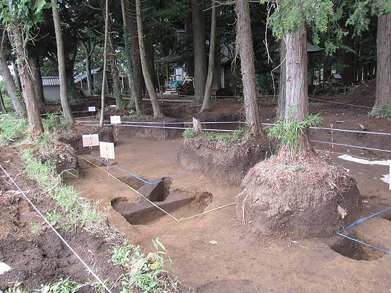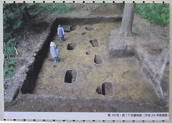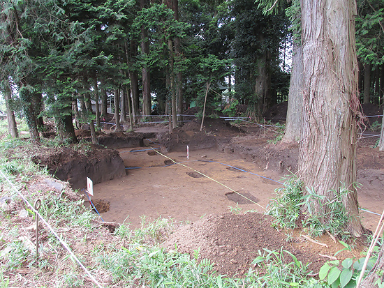 溝跡はいくつか発掘調査で確認されていますが、特に注目すべきは建物群を囲む大型溝跡です。道路跡と並行するように道路跡東側に確認されました。道路に伴う施設の区画溝と考えらます。区画溝の北辺は想定ライン上で確認され、上幅5.22~5.31m、深さ1.74m~1.89mの逆台形状の底面が更に台形状に窪む断面形状であったといいます。南辺は愛宕神社拝殿の西約50m付近がコーナー状に東に折れているのが確認され、南辺調査区36・37で確認された第25号建物跡の柱穴の西までが確認されています。この溝跡は8世紀後半~10世紀まで機能していたと考えられ、土塁や掘り直しの跡も確認されているようです。